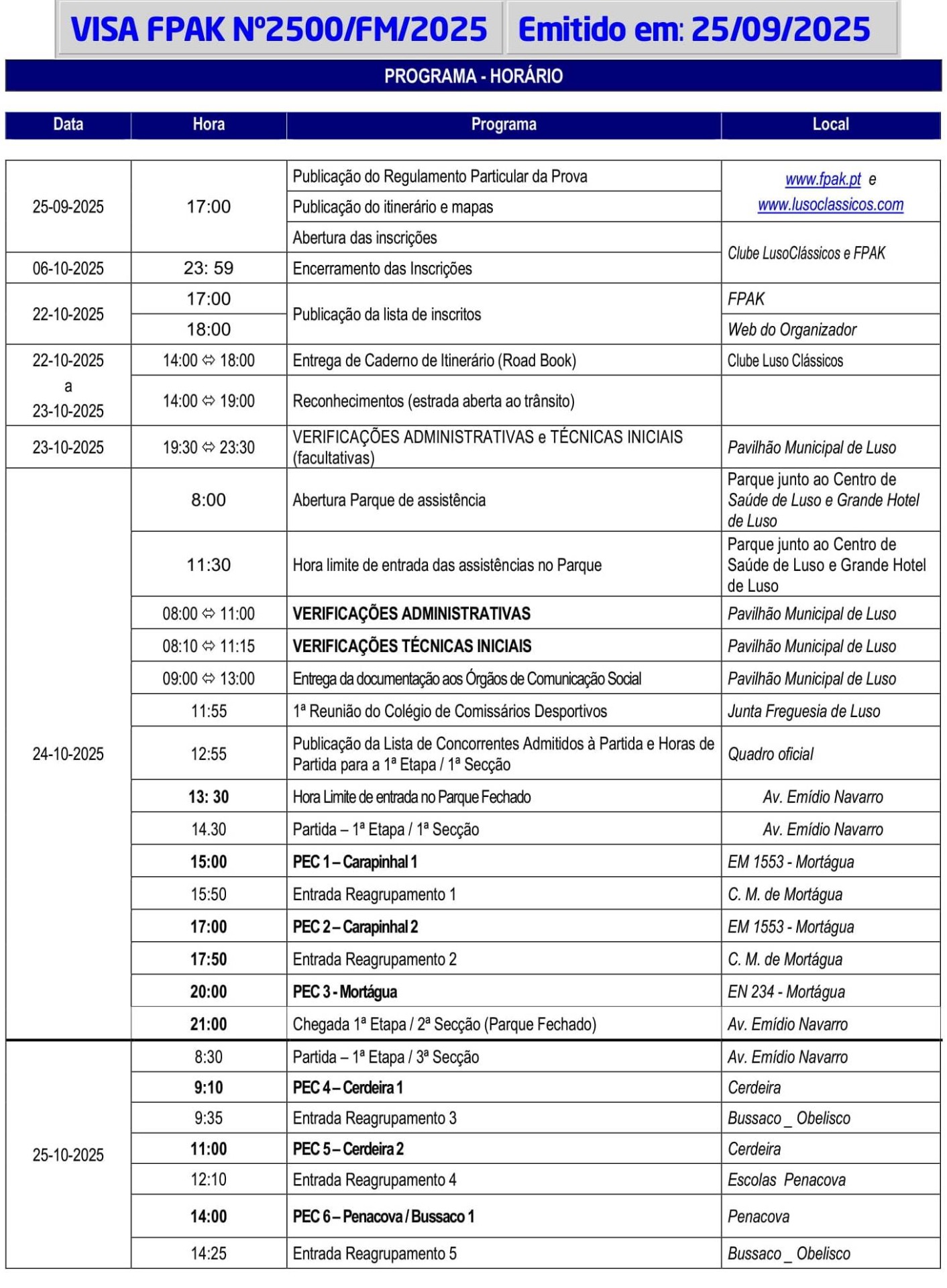 22.30 horas - Entrada em Parque Fechado. Local - Avenida Emídio Navarro, Luso