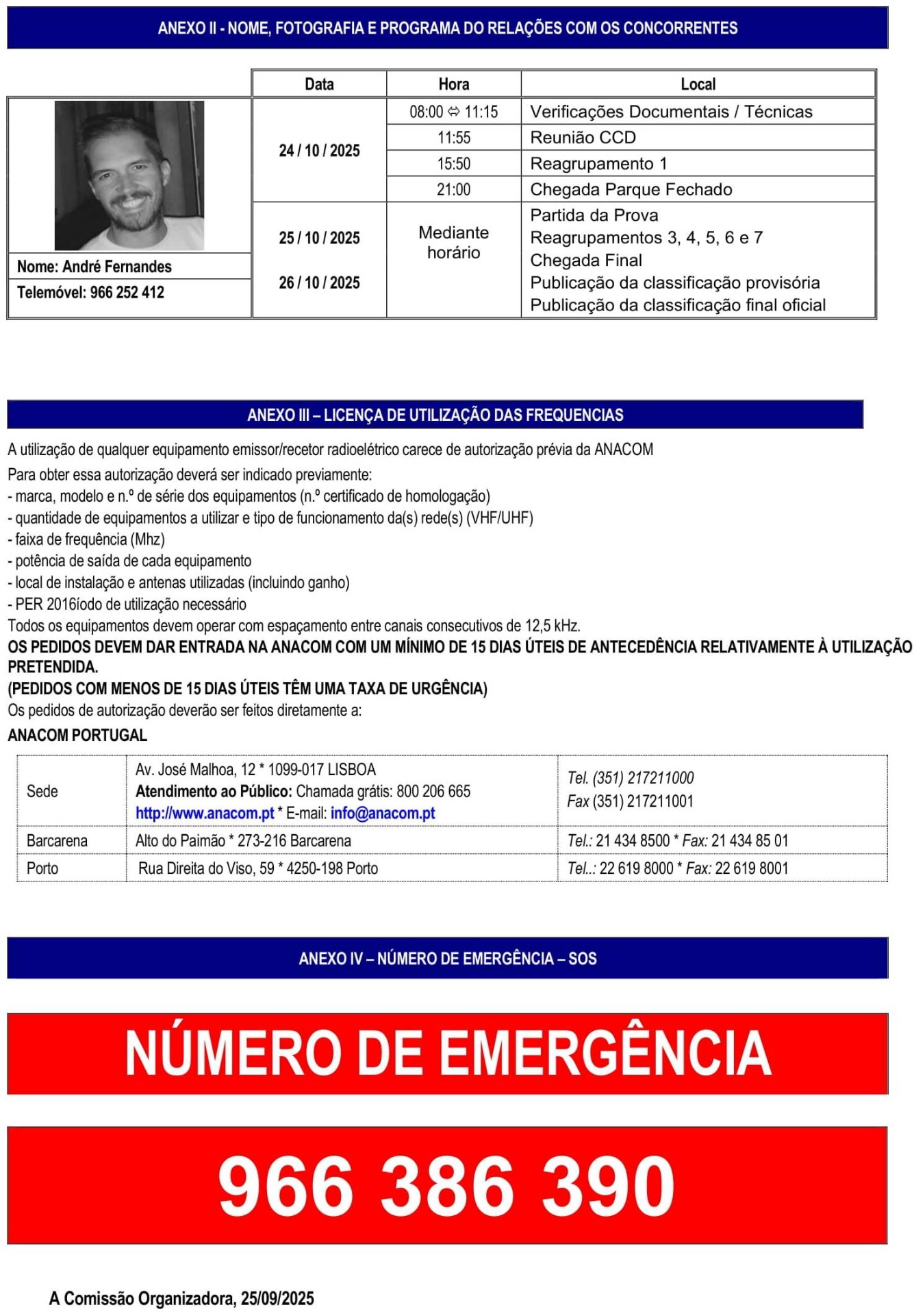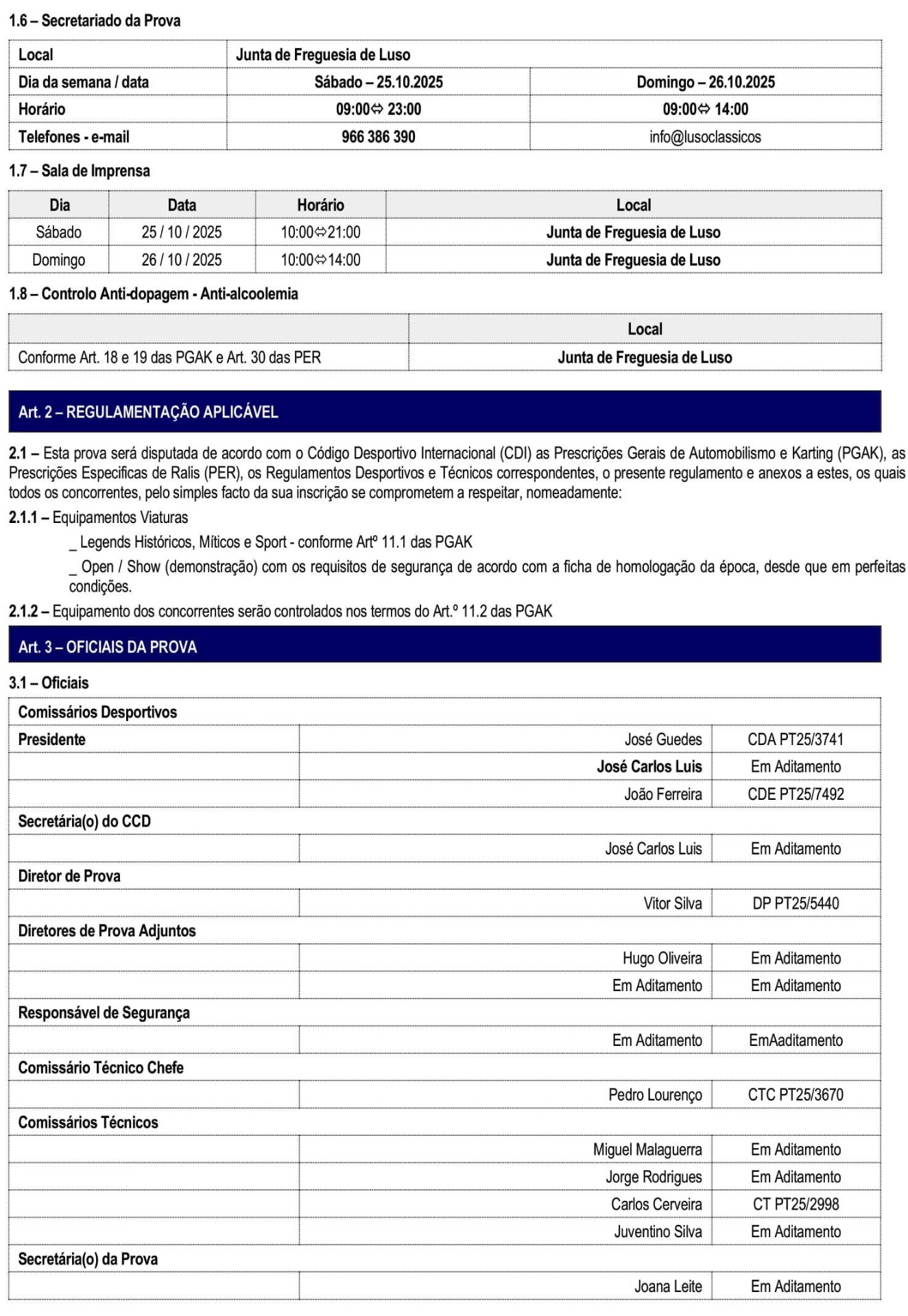 19.30 ás 23.30 horas - Verificações documentais e técnicas facultativas. Local - Pavilhão Municipal de Luso